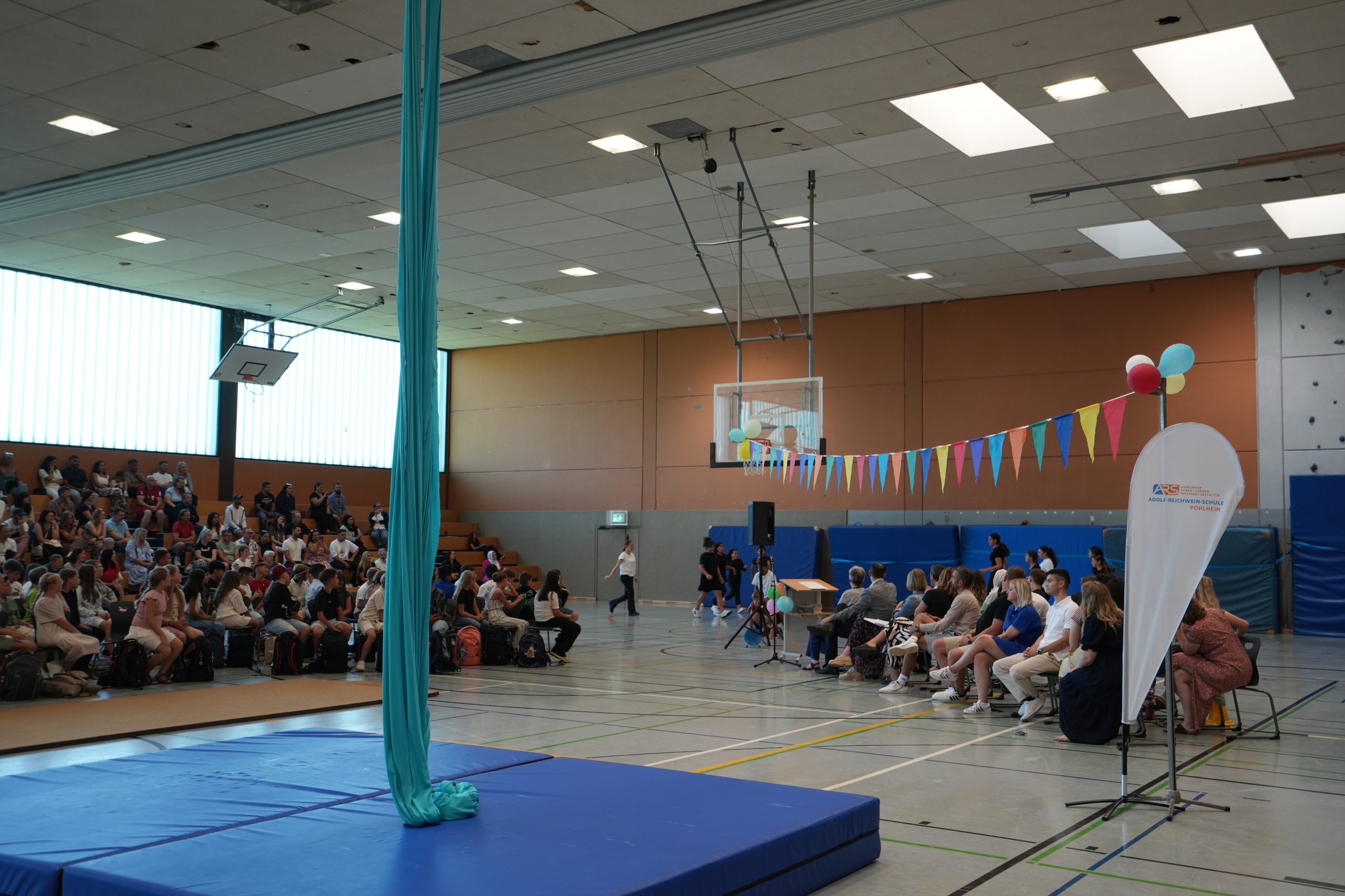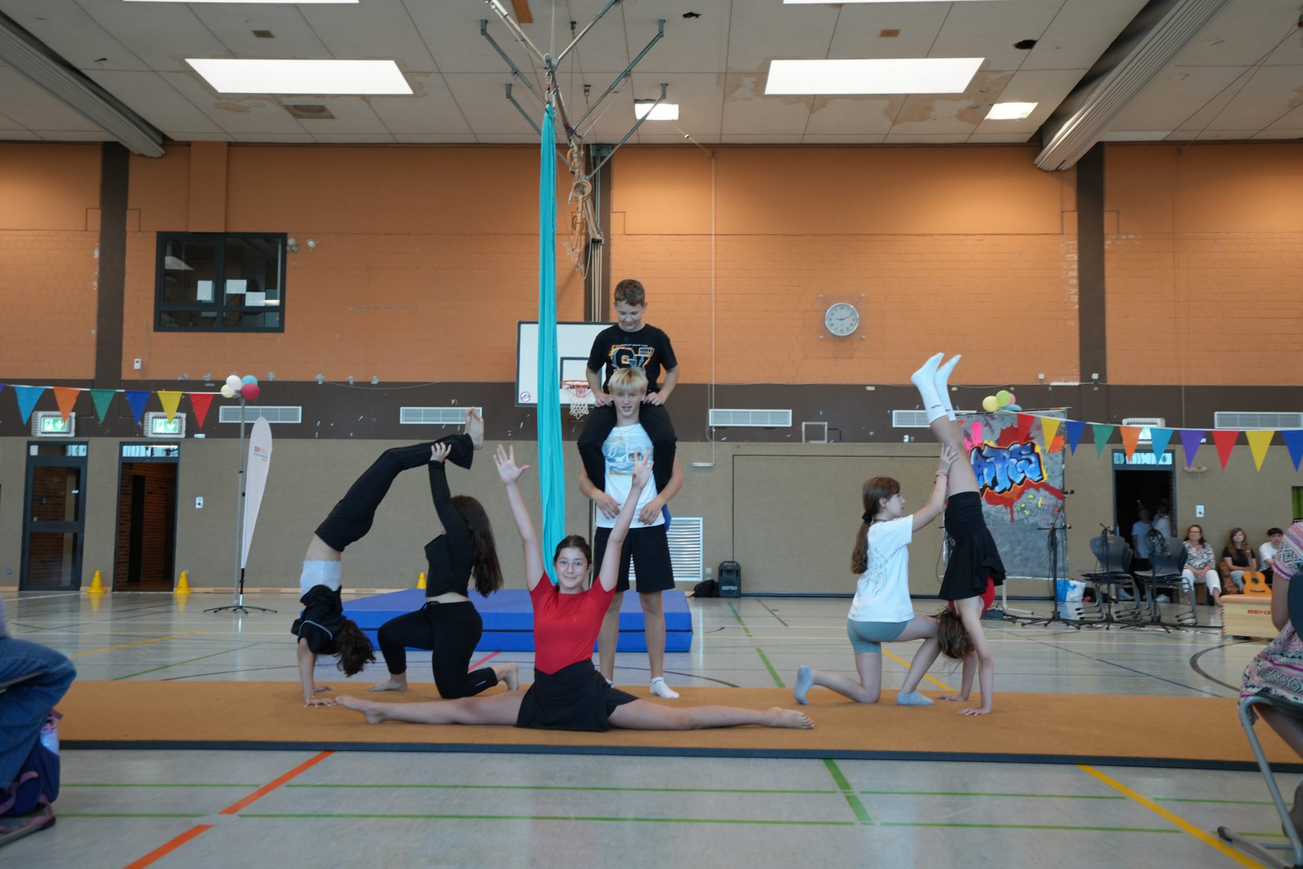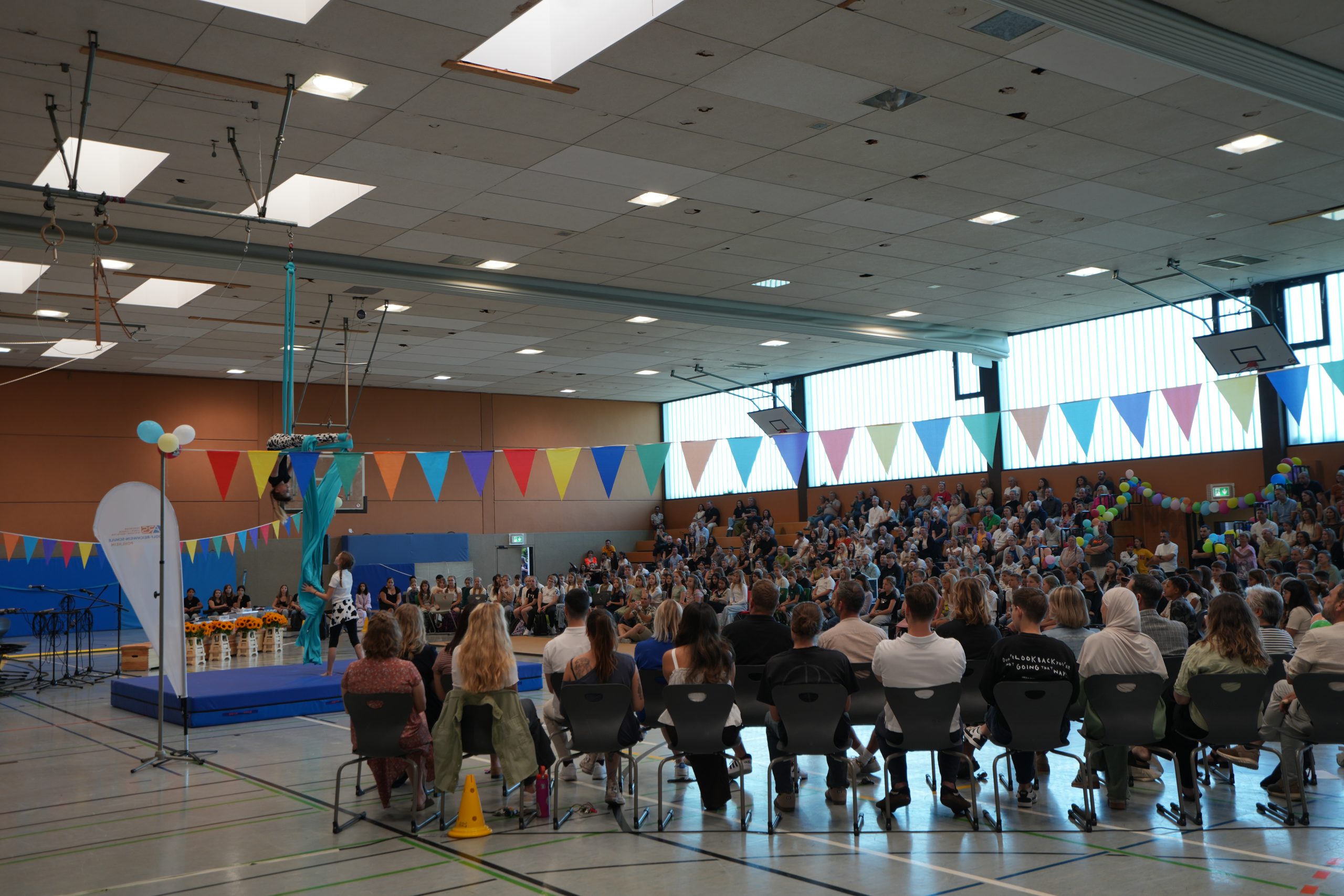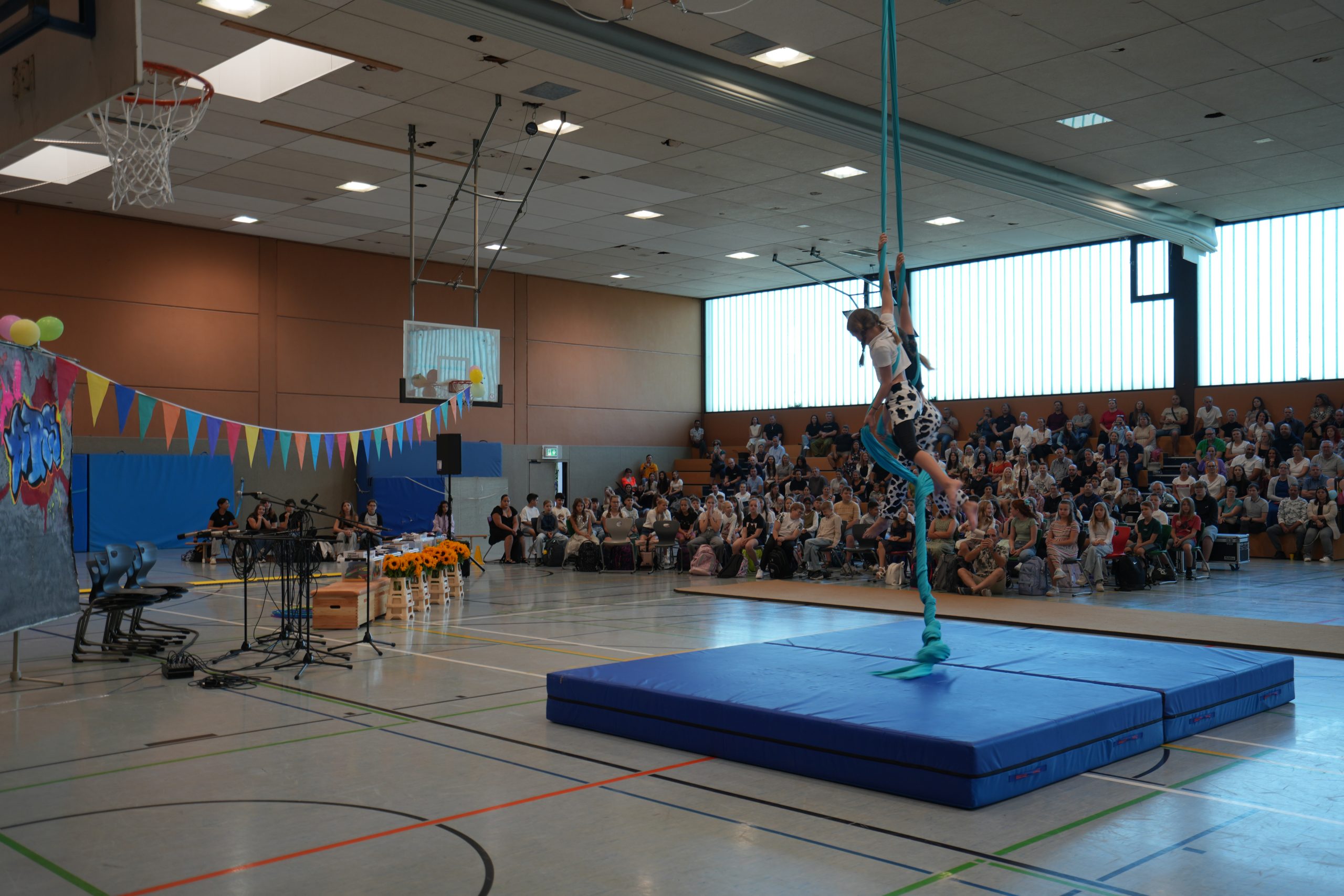 Besonders viel Beifall erhielten Lia Hartmann und Charlotte Wricke (Kl. 6a) für ihre phantastische Darbietung am Vertikaltuch. Im Anschluss richtete die Schulleiterin Frau Brüll das Wort an die Gäste und hob die Bedeutung von Gemeinschaft, Neugier und Mut für den Start an der neuen Schule hervor.