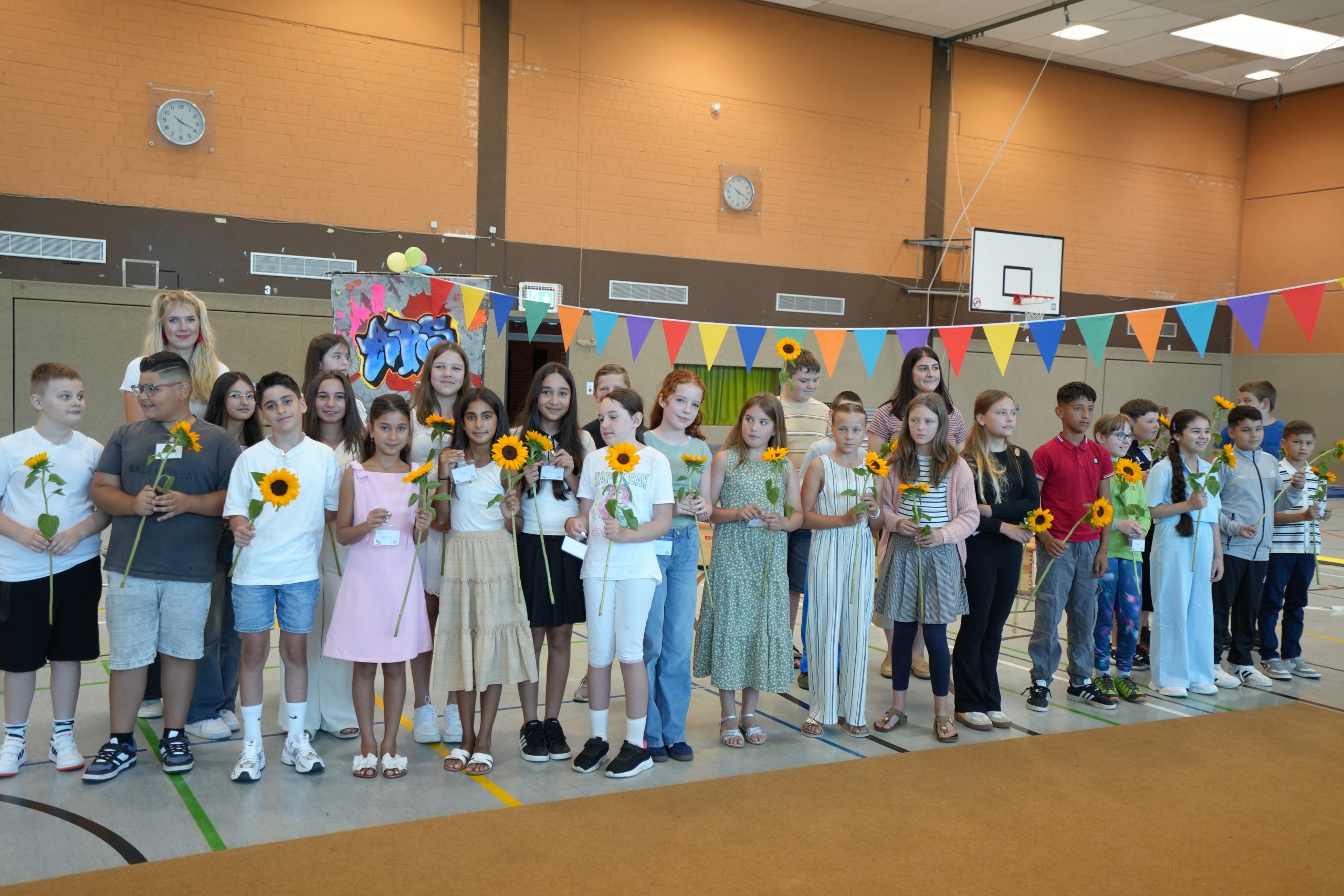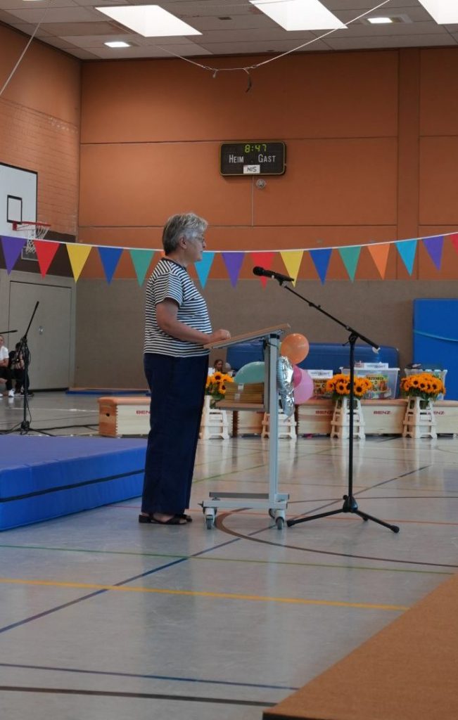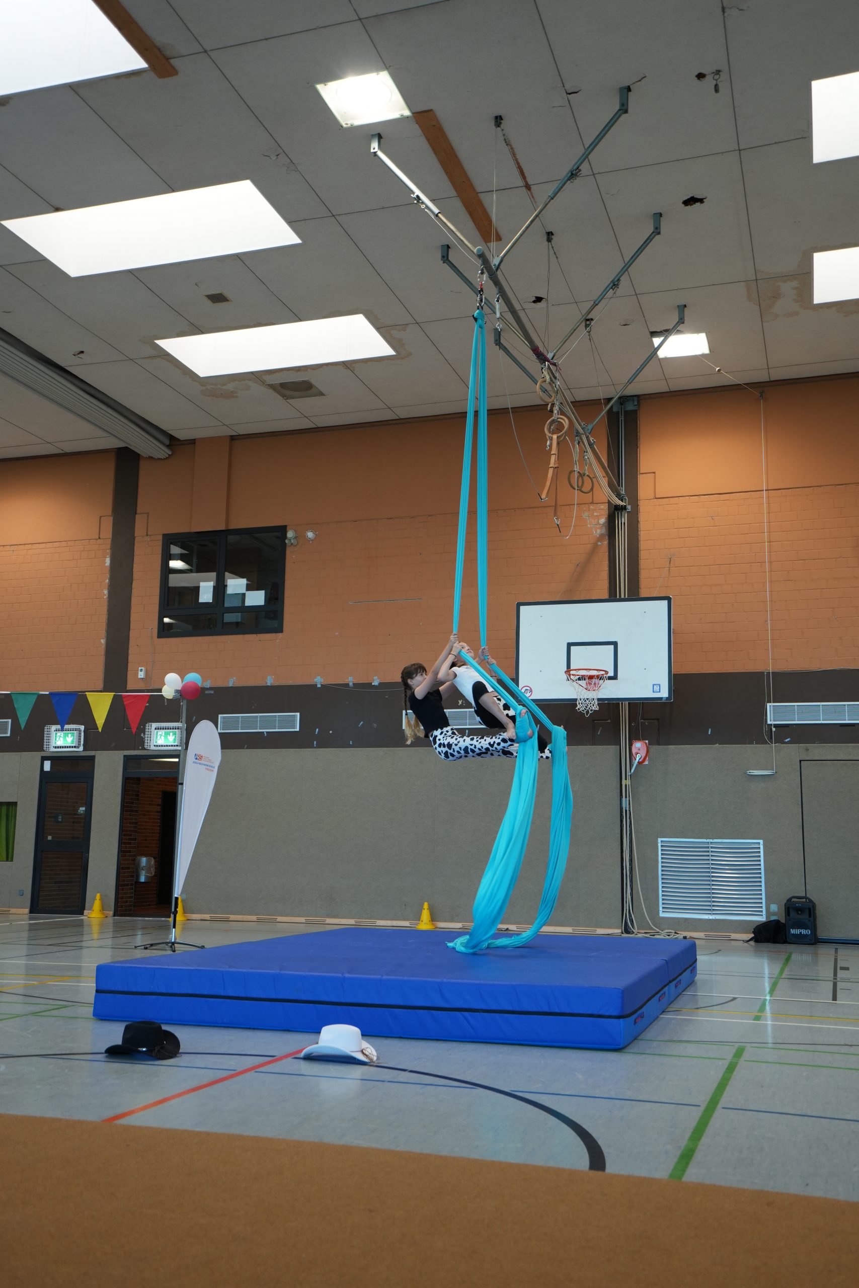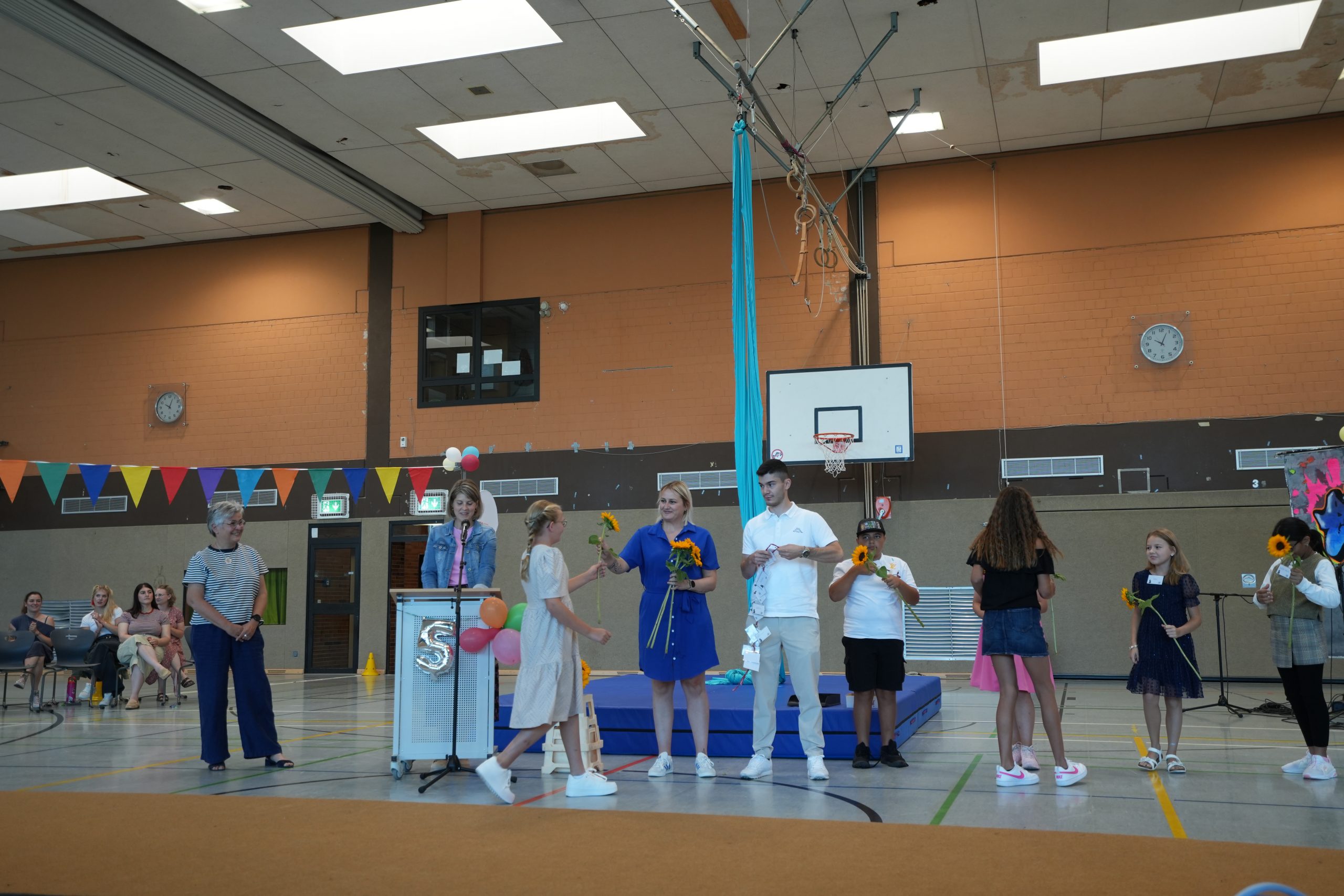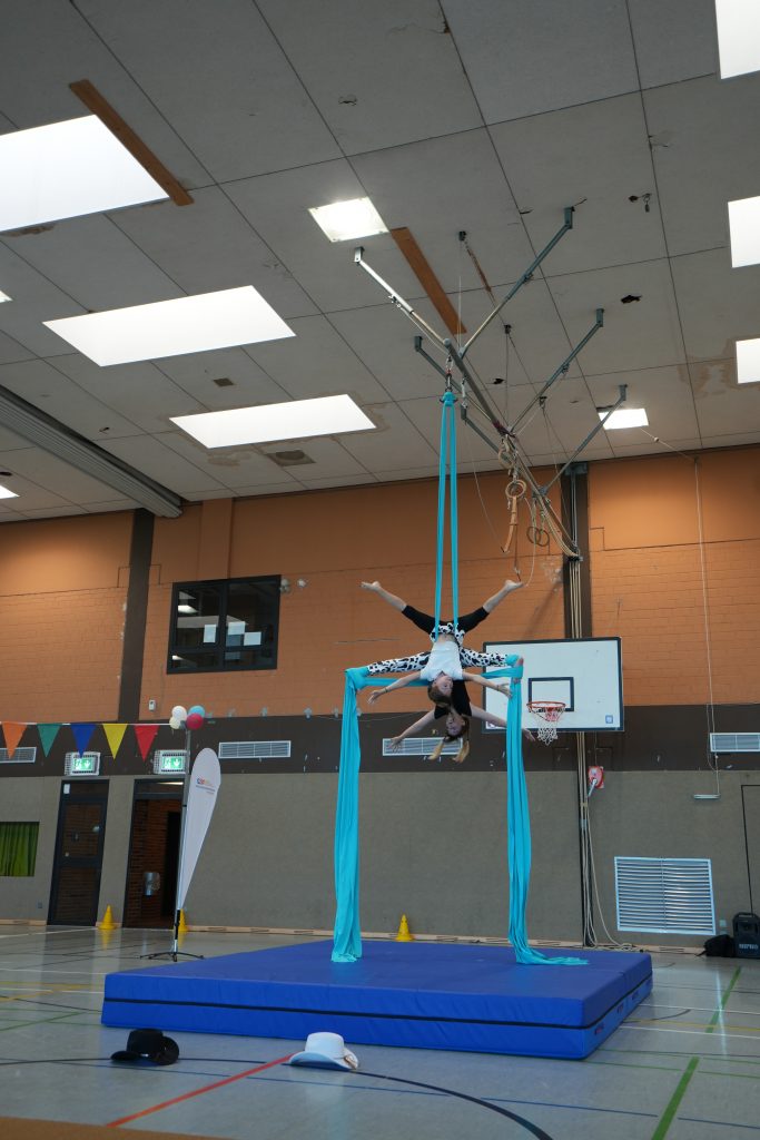 Besonders viel Beifall erhielten Lia Hartmann und Charlotte Wricke (Kl. 6a) für ihre phantastische Darbietung am Vertikaltuch. Im Anschluss richtete die Schulleiterin Frau Brüll das Wort an die Gäste und hob die Bedeutung von Gemeinschaft, Neugier und Mut für den Start an der neuen Schule hervor.