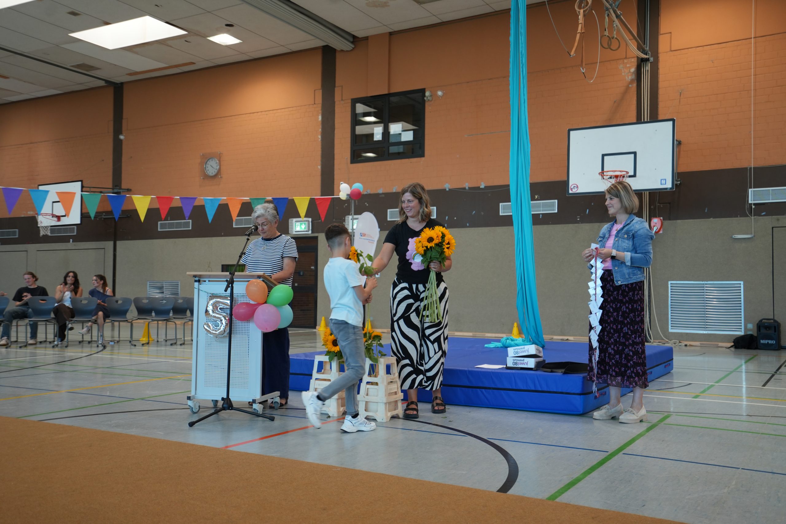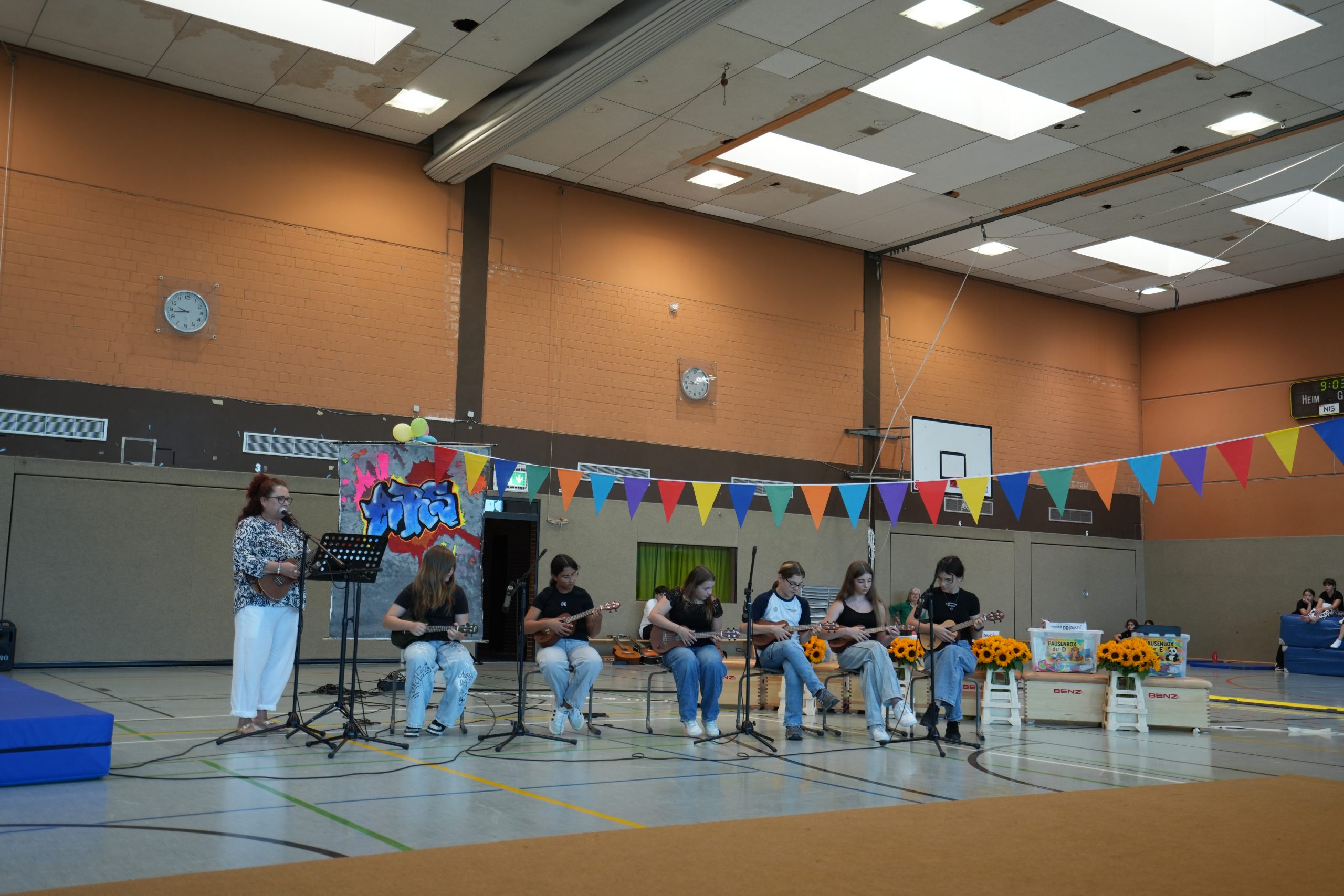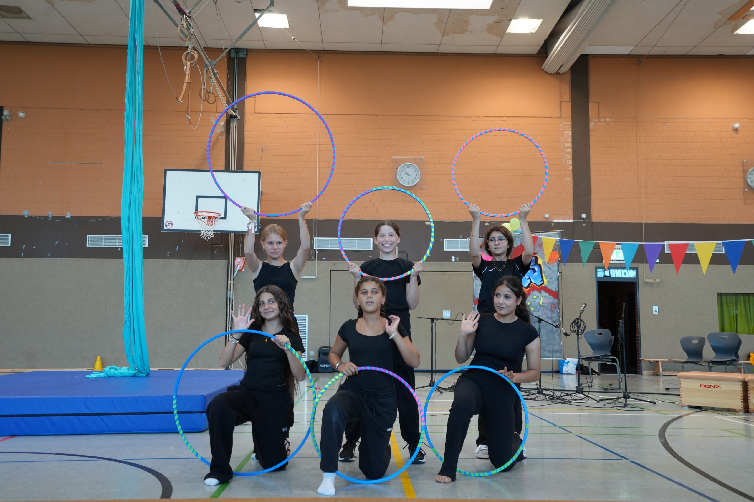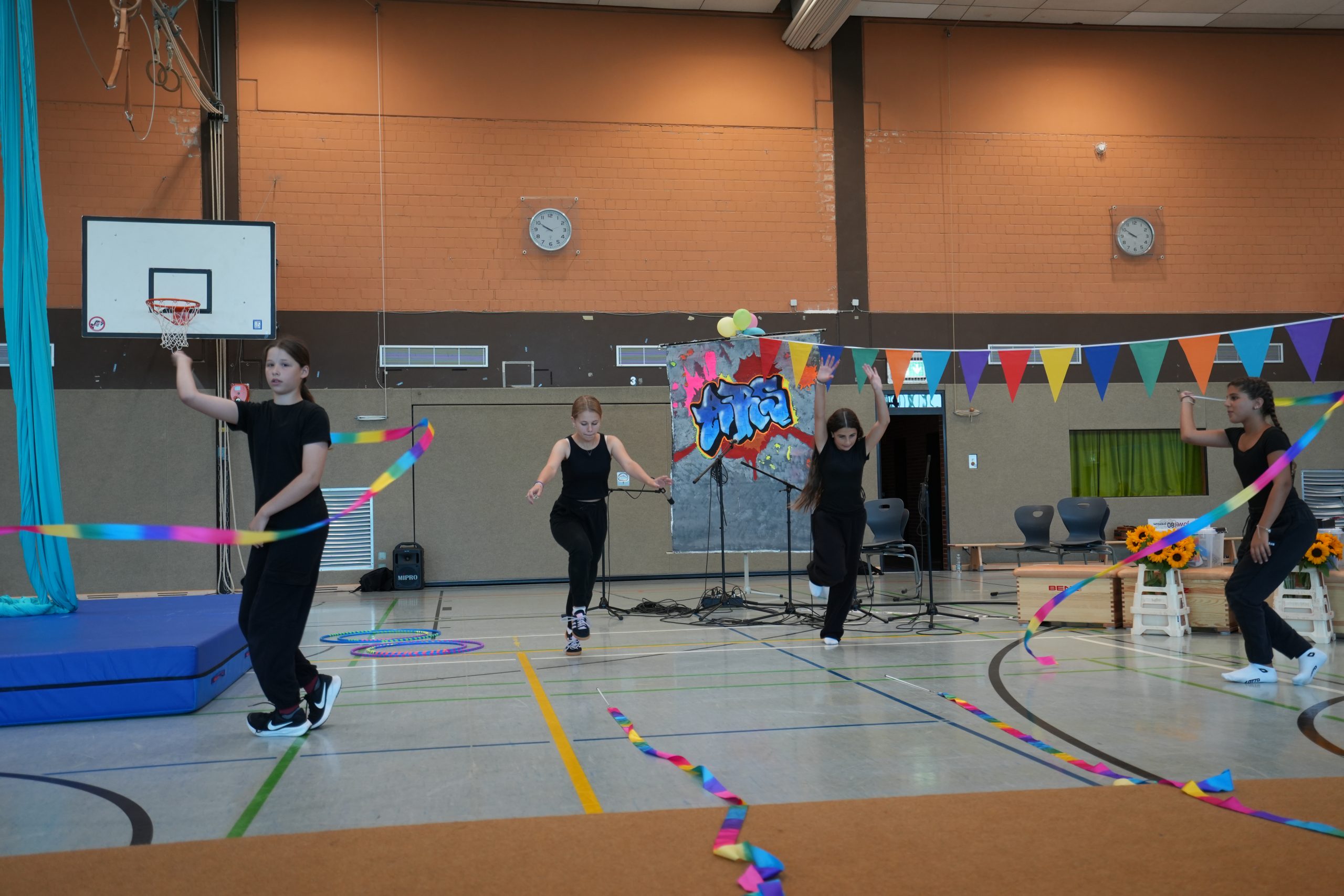Sportlich und musikalisch ging es weiter: Die Hip-Hop-AG von K. Scholl zeigte ihr Können, bevor die Ukulele-AG unter der Leitung von Andrea Most-Roggenbuck ein Liedbeitrag darbot. Die Schülervertretung stellte sich durch Jennifer Zimmer persönlich vor, ehe die Gruppe rund um Antonia Döring mit einem Tanz aus Ringen und Tüchern für einen weiteren Höhepunkt sorgte.