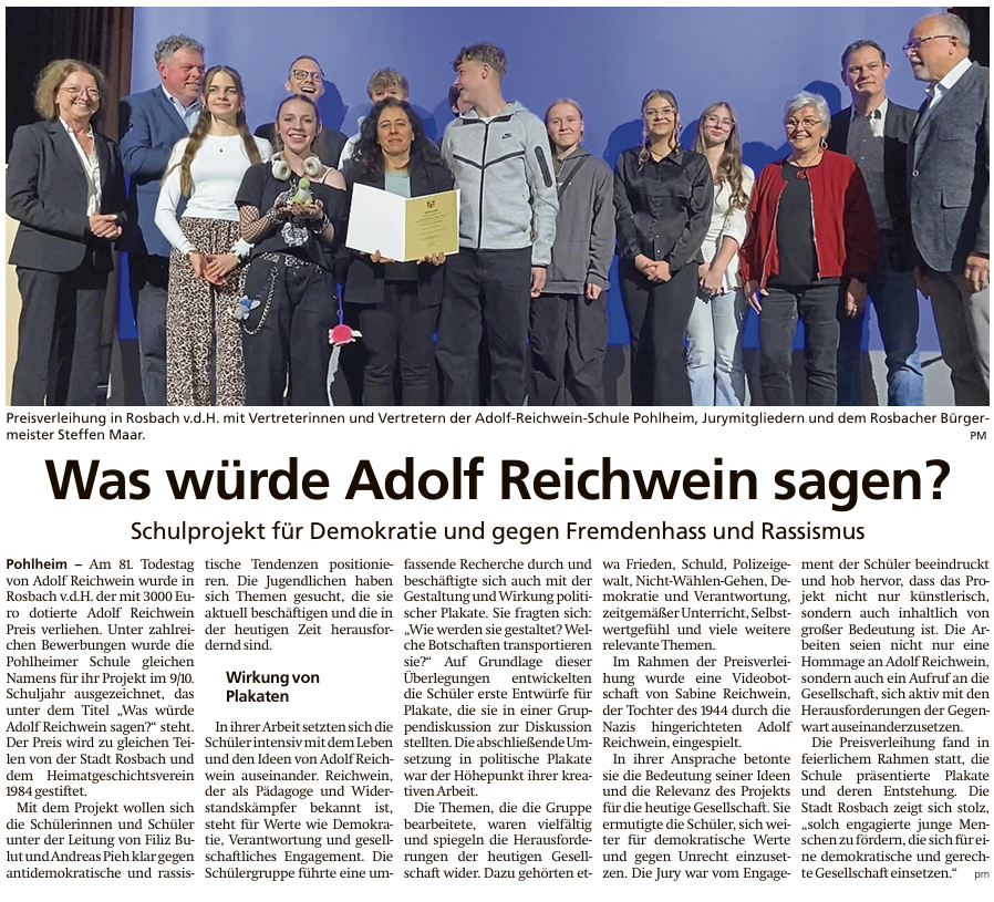 Am 14. August 2025 trat die Jury des Adolf-Reichwein-Preises der Stadt Rosbach v. d. Höhe zusammen, um über die diesjährige Auszeichnung zu entscheiden. Unter dem Vorsitz von Bürgermeister Steffen Maar und mit weiteren Mitgliedern – Dr. Michael Limlei (Rosbach), Sabine Reichwein (Hiddensee) und Raya Schmidt (Schulleitung der Adolf-Reichwein-Schule Friedberg) – fiel die Wahl auf das Projekt „Was würde Adolf Reichwein sagen …?“ der Adolf-Reichwein-Schule Pohlheim.