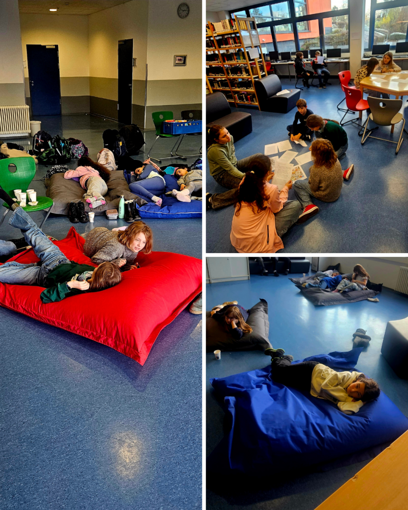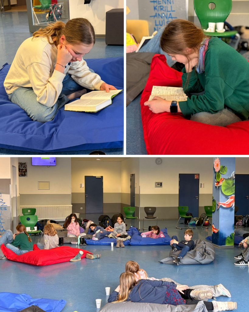 Zahlreiche Schülerinnen und Schüler der Jahrgangsstufe 5 machten es sich gemeinsam mit ihren Deutschlehrkräften Frau Petek und Frau Kinzebach sowie unserer Stufenleiterin Frau Metzger in der Mediathek und dem Aquarium gemütlich, um in die Welt der Bücher einzutauchen.