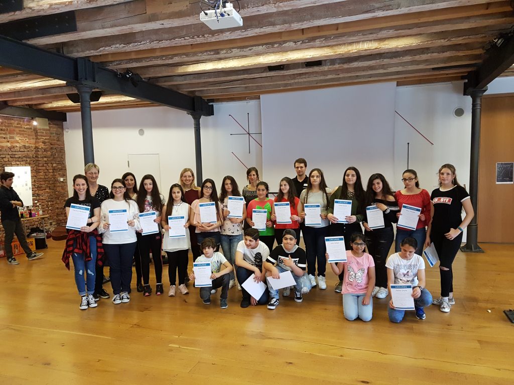 Nach einer kurzen Generalprobe am 4. Tag präsentierten die Schüler voller Stolz und Freude ihre Ergebnisse einem größeren Publikum im Rahmen einer kleinen Feier, die Laila Samuel vom Mathematikum moderierte. Zuerst tanzten die Schüler unter Anleitung der beiden Profitänzer ihren Körperzahlen-Tanz vor. Anschließend wurden die am ersten Tag angefertigten Videos gezeigt. Danach stellten stellvertretend für die vielen tollen Experimente 5 Schüler ihr Experiment vor. Bevor die Teilnehmer ihre Urkunde erhielten überraschten sie das Mathematikum mit einem persönlichen Dankeslied für den Workshop.