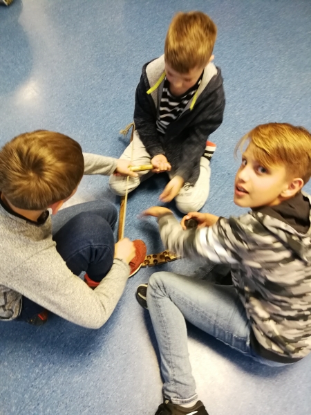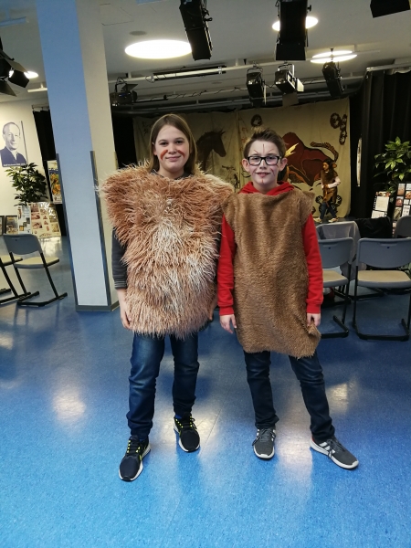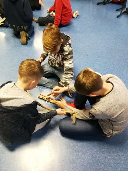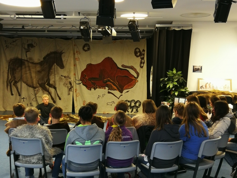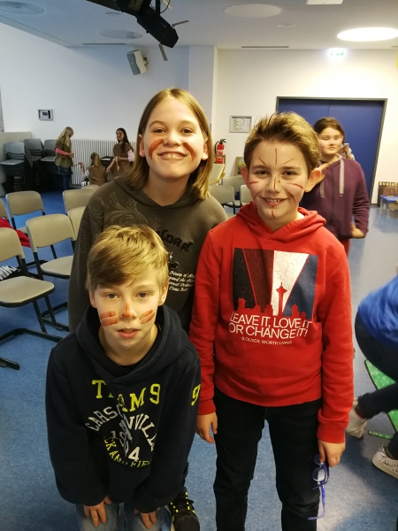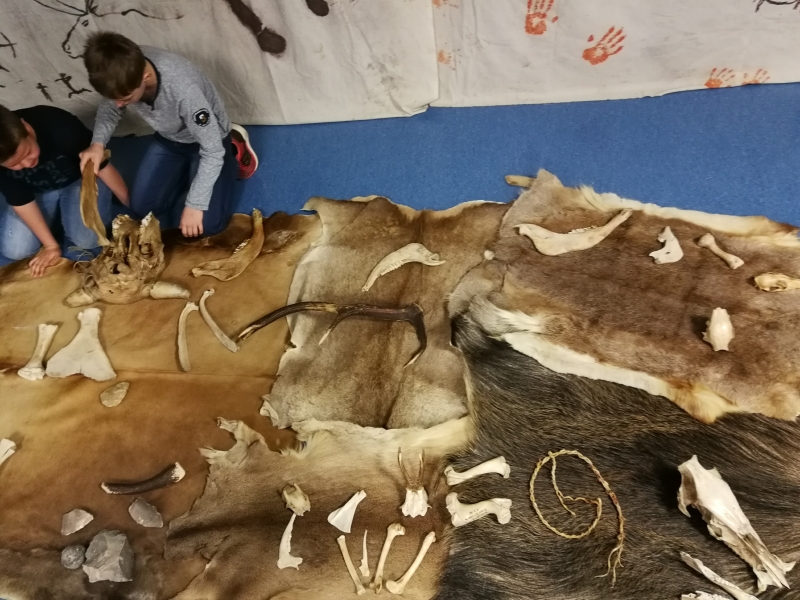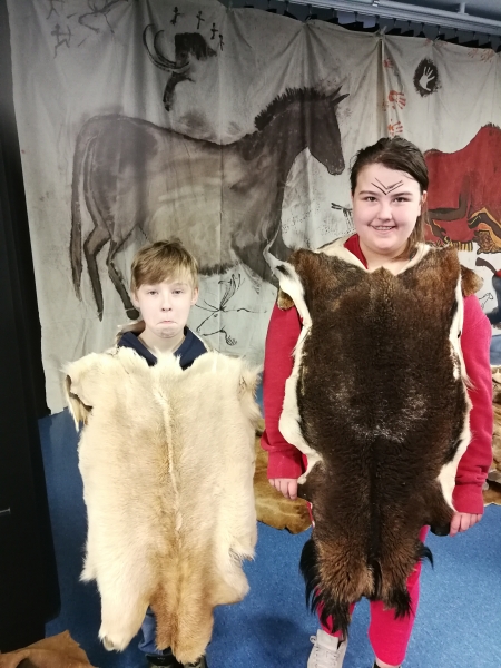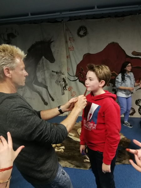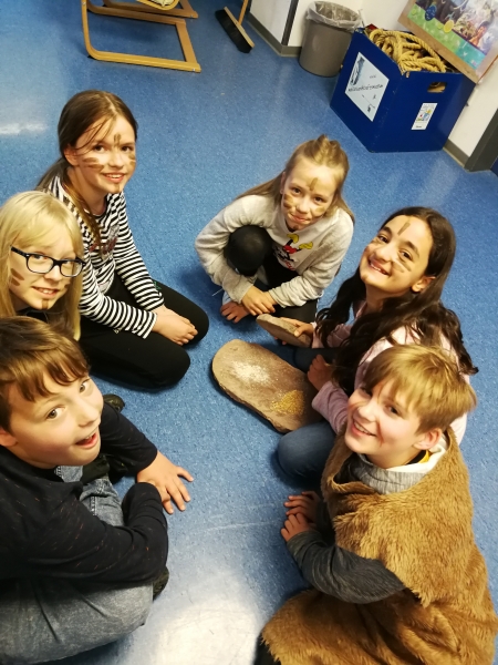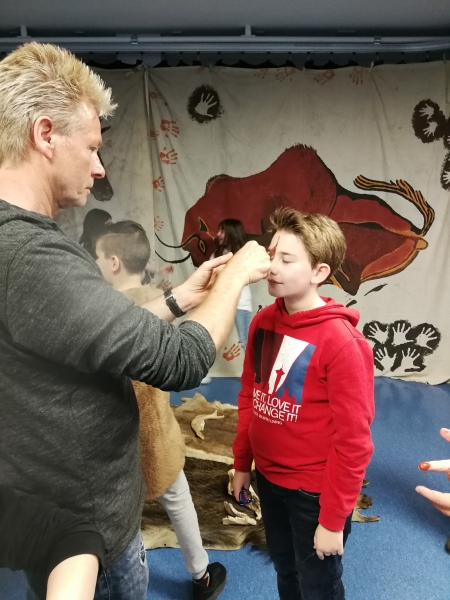 So wurden die fast 100 Schüler und Schülerinnen des Jahrgangs 5 am 8. und 9. Mai von Herrn Dr. Rittweger vom Mobilen Landschaftsmuseum (MoLaMu) begrüßt. In seinem Mitmachmuseum konnten die Kinder Originalfunde bestaunen und anfassen, sich selbst wie Steinzeitmenschen kleiden und ihre Gesichter mit Naturfarben bemalen. Außerdem lauschten sie spannenden Geschichten aus dem Alltag und lernten z. B., wie Feuer ohne Feuerzeug gemacht wurde. Neben einem Steinzeitquiz konnten die Clans der Ubs und Bas auch beim Bogenschießen gegeneinander antreten.
