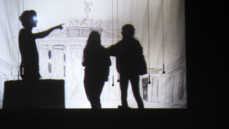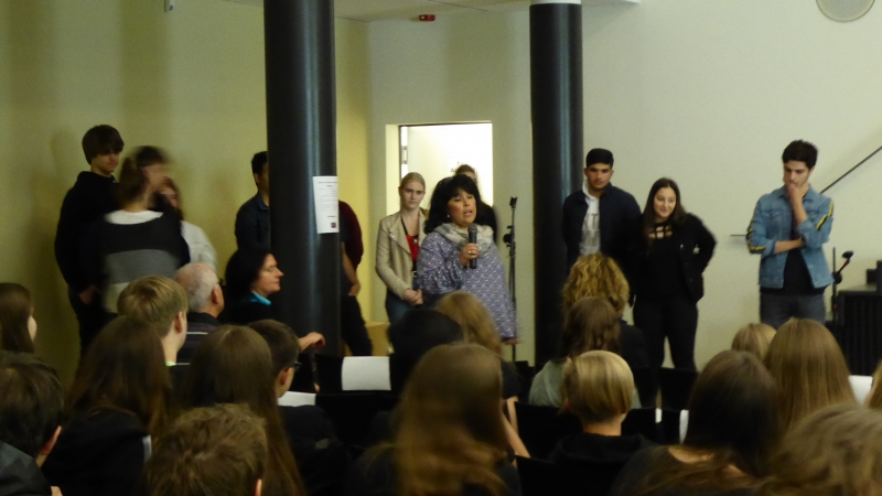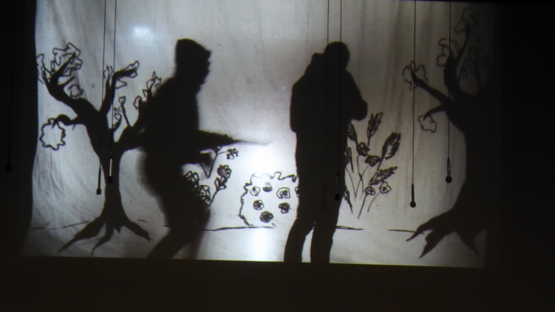 Schließlich zeigten 7 hessische Schulen ihre Stücke. Dabei waren zwei Videoproduktionen und 4 live Theaterstücke entstanden und das von der ARS vorgetragene ganz besondere Video, das eine Schattentheaterproduktion aufgezeichnet hatte. Der Titel „Tres Mundos – drei Welten“ gab schon einen Hinweis auf den Inhalt: Es sind die ganz privaten individuellen Geschichten von Emanuela Petraio, Musawer Amin und Elie Joulan. Alle drei haben aus unterschiedlichen Gründen ihr Heimatland verlassen und sind zu uns nach Deutschland gekommen. Ihre persönlichen Schicksale werden sehr eindrücklich dargestellt und hinterlassen beim Zuschauer Gänsehaut und eine nachdenkliche Stimmung. Das Schattentheater wurde meisterlich von Sarah Schlapp illustriert und von Elie Joulan am Klavier begleitet. Die wochenlangen Proben, die auch 7 Wochenenden in der Schule beinhalteten, das Aufzeichnen der Szenen und das Schneiden des Filmmaterials haben von den Schülerinnen und Schüler und ihrer unermüdlichen Lehrerin sehr viel abverlangt. Auch der pensionierte Kollege Herbert Bücher half beim Aufzeichnen mit und so entstand gleich bei der ersten Produktion der ARS ein Meisterwerk! Dies war auch am frenetischen Beifall des Publikums in Frankfurt festzustellen, und den vielen Nachfragen, wie man es denn geschafft habe, so etwas Tolles zu produzieren! Letztlich wird mit diesem Film ein Beispiel gelungener Integration dokumentiert.