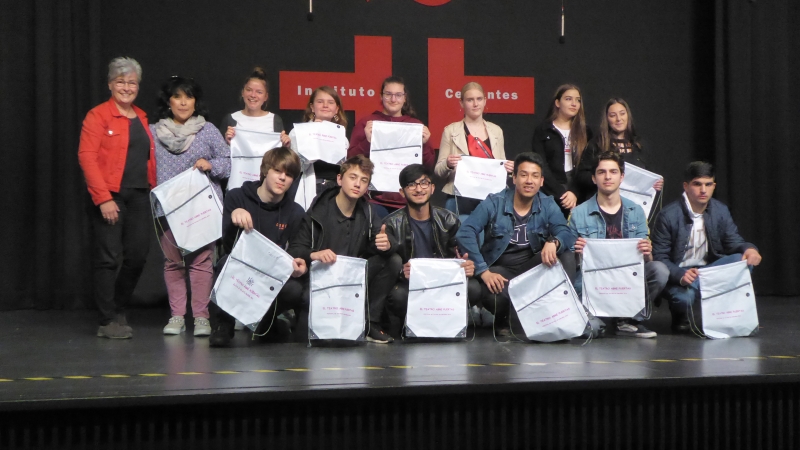 Dass diese Aussage stimmt, konnten wir am 28.05.19 sehr eindrucksvoll im Instituto Cervantes in Frankfurt erleben. Dort fand zum ersten Mal in Hessen ein spanisches Theaterfestival statt und auch von unserer Schule nahm eine Gruppe von 10. Klässlern unter der Leitung von Alicia Feregrino teil. Eröffnet wurde die Veranstaltung von Herrn Ramiro Villapadierna (Leiter des Instituts), moderiert von den beiden Damen Celia Cid und Claudia Molnar. Der ebenfalls geladene Staatssekretär Herr Manuel Lösel (Hessisches Kultusministerium) hob die Bedeutung des Theaters durch den Hinweis auf das Shakespeare Zitat „die ganze Welt ist eine Bühne und alle Frauen und Männer bloß Spieler“ hervor. Er betonte die Einzigartigkeit des Instiuto Cervantes, das es ermögliche einen Schutzraum zu schaffen, in dem das Institut diese Bühne biete und den Teilnehmerinnen und Teilnehmer die Möglichkeit bietet in der spanischen Sprache ihre selbst entwickelten und eingeübten Theaterstücke zu präsentieren. Auch die Konsulen von Mexiko, Peru und Chile ließen sich dieses einmalige Spektakel nicht entgehen.