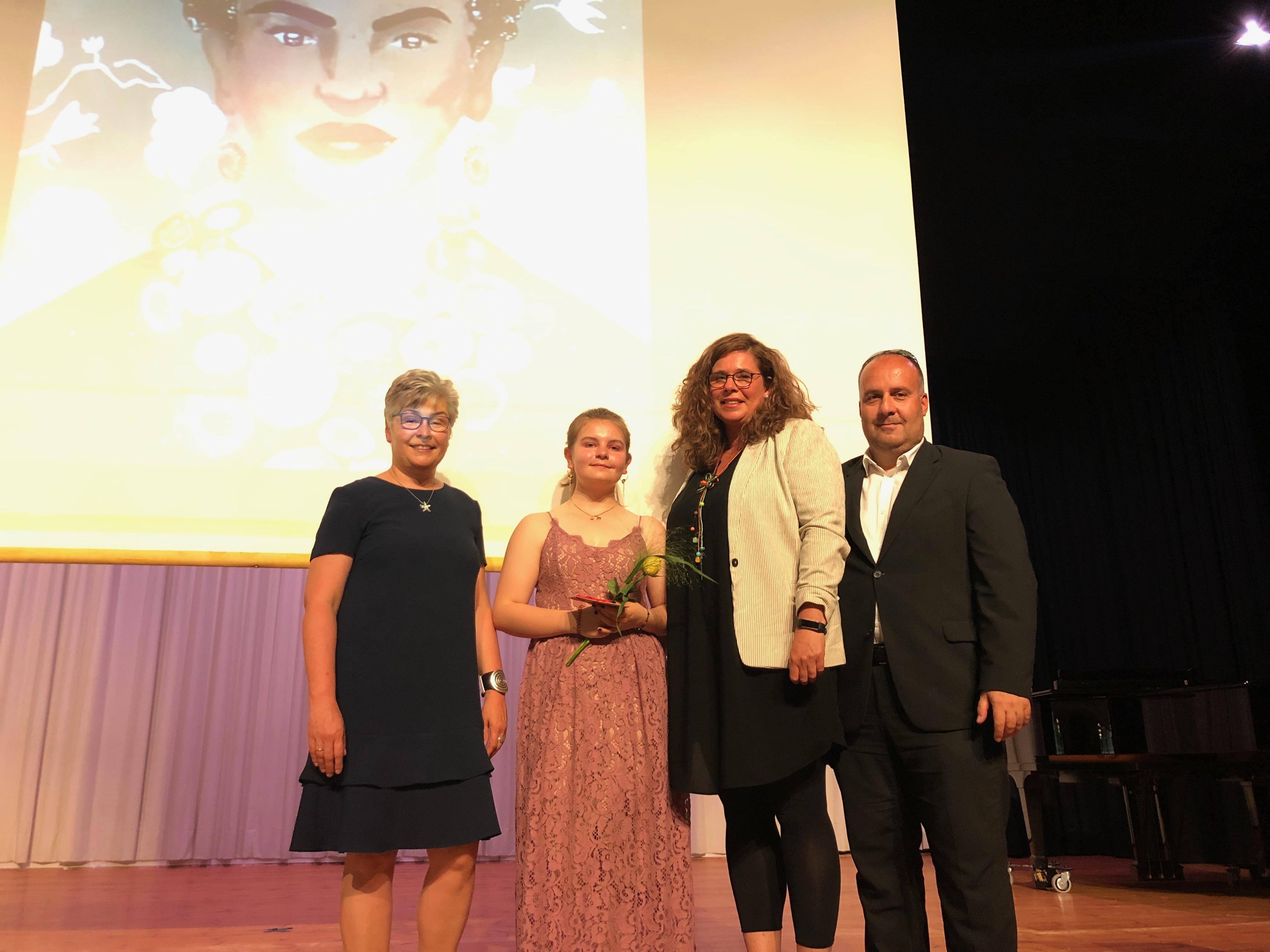 Für besondere Leistungen ehrten Frau Brüll und Herr Schmidt vom Förderverein das Schulsprecherteam, die Mitglieder des Spanischen Theaters unter Leitung von Alicia Feregrino, die Schülerin Sara Schlapp für außergewöhnliches Leistungen im Bereich Kunst und Elie Joulan für seine besonderen musikalischen Leistungen. Arne Brockhaus (1,2), Eva Schön (1,3) und Guadalupe Saliba (1,4) erhielten Auszeichnungen für die besten Leistungen hinsichtlich des Übergangs in die gymnasiale Oberstufe, Yagmur Yilmazer (1,8), Susi Danho (2,0), Lukas Acer (2,2), Lena Buran (2,2)und Alena Lang (2,2) für die besten Realschulabschlüsse und Bercin Varli (1,6), Hannah Finke (1,9) und Esin Erdogan (2,3) für die besten Hauptschulabschlüsse.