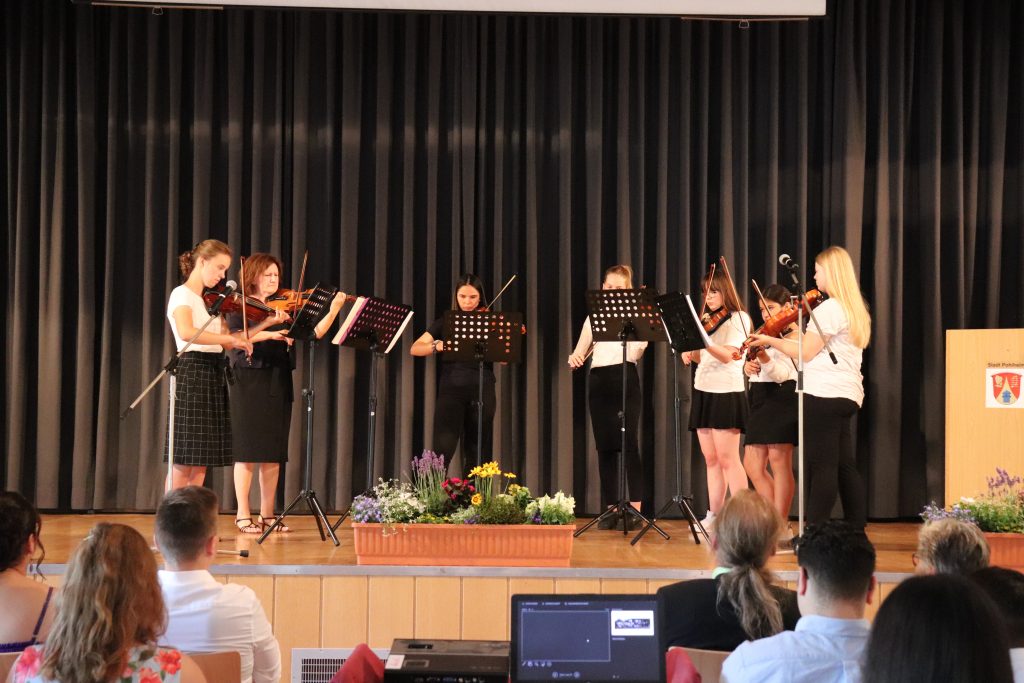 Nach der Eröffnung durch das Kammerorchester unter Leitung von Frau Mrokon und der Begrüßungsrede der Direktorin Petra Brüll führten Hanna Nilchi-Bar (9a) und Alexander Klan (9b) durch das einstündige Programm.
