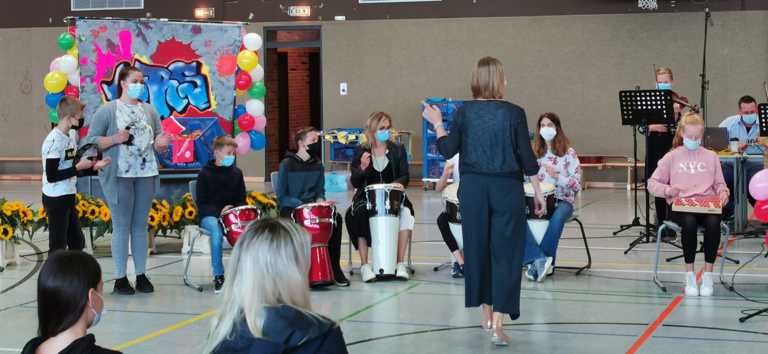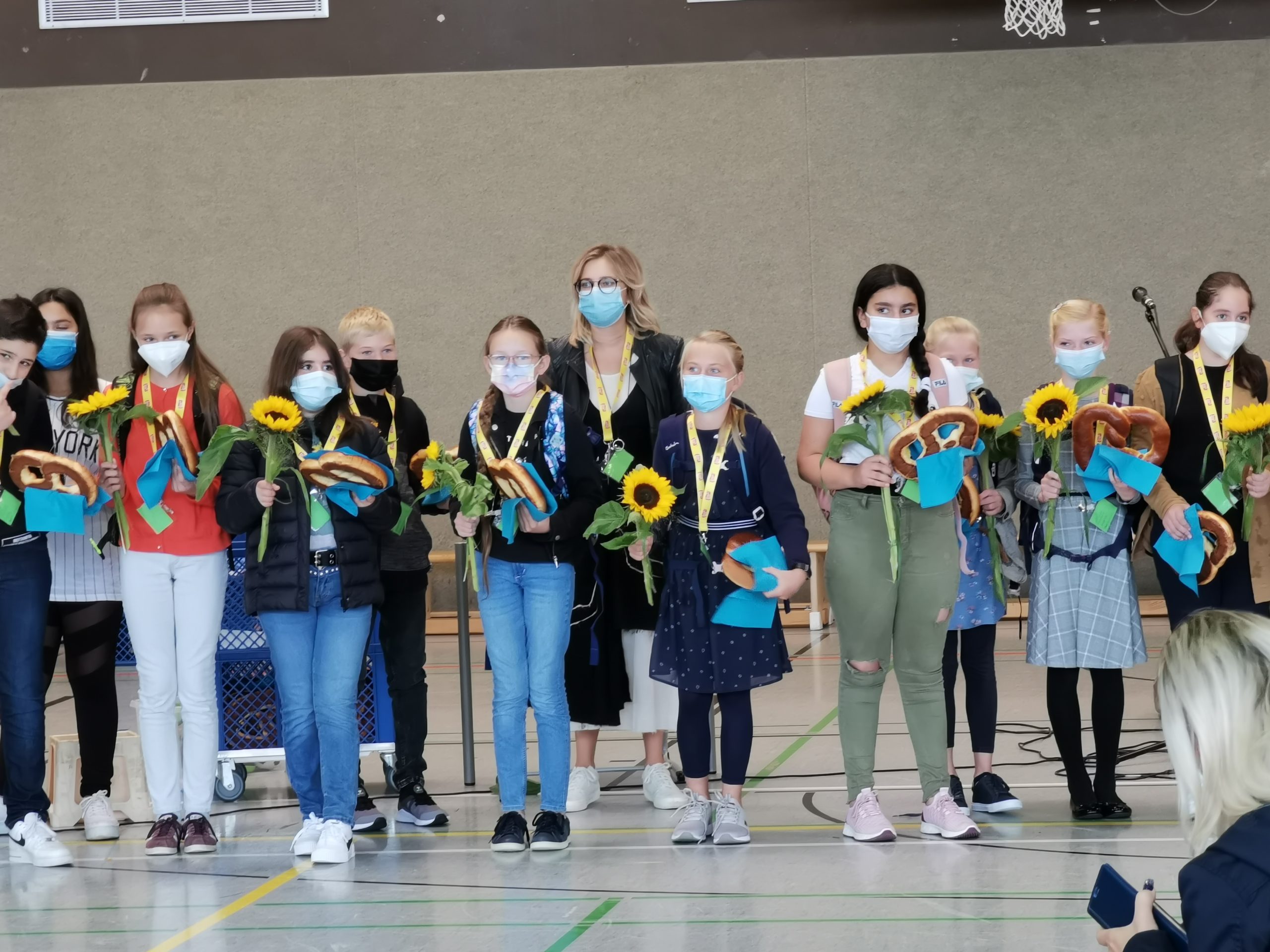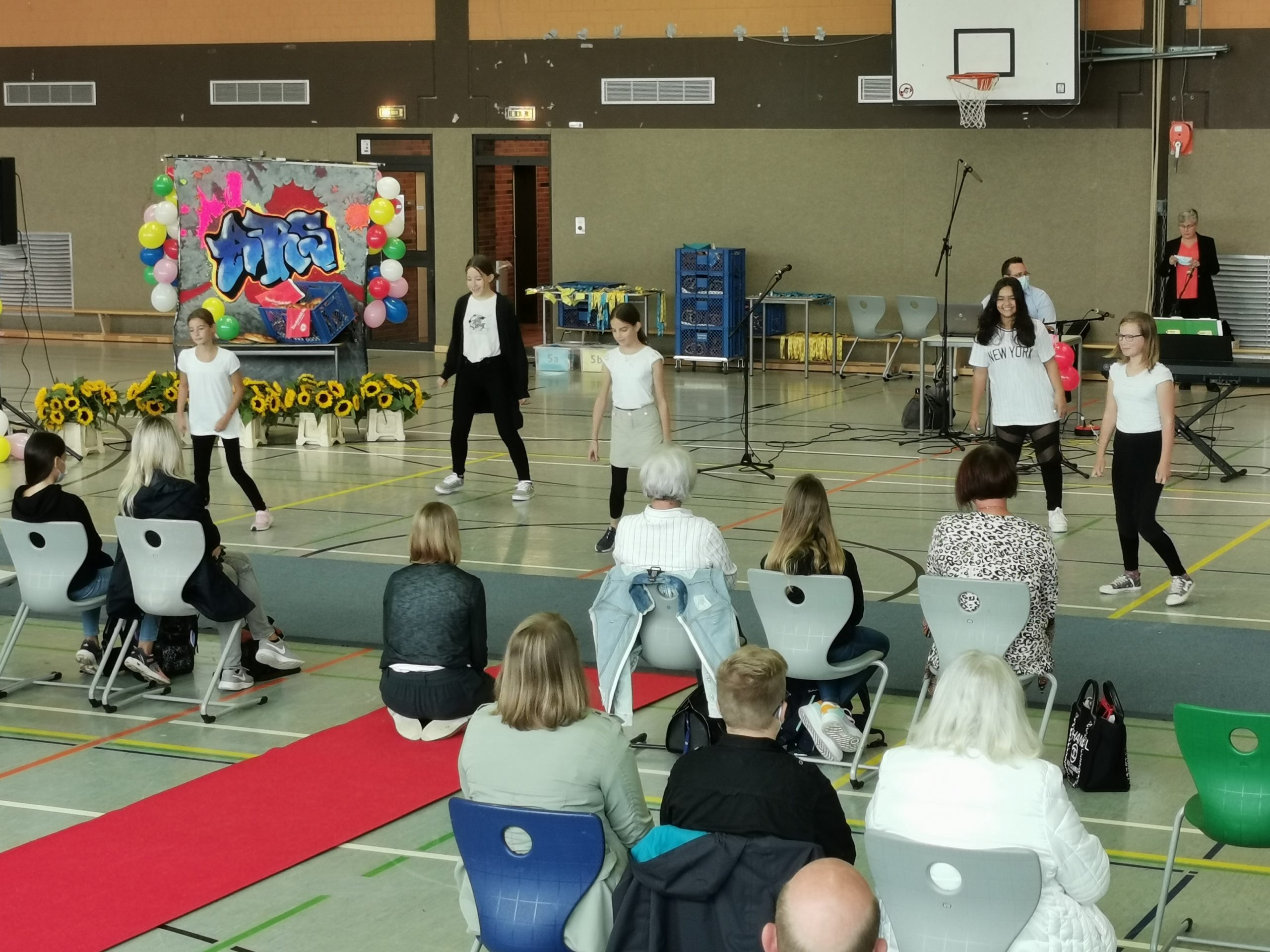 Petra Brüll begrüßte die neuen Schülerinnen und Schüler sowie deren Eltern und machte ihnen mit der Geschichte „Freunde finden leicht gemacht …“ von Dorothee Schmid Mut, neue Freunde an der Schule zu finden und sich aktiv in das Schulleben einzubringen. Auch die Eltern wurden zu letzterem herzlich eingeladen. Es folgte das Lied „Gemeinschaft macht stark“, welches die beiden Musiklehrerinnen Christiane Metzger und Lisa Ludwig unter Begleitung der Schülerband sangen. Nachdem drei Schülerinnen der SV gemeinsam mit dem Verbindungslehrer Max Schneider die Arbeit der Schülervertretung vorgestellt und zum Mitmachen animiert hatten, zeigte eine kleine Gruppe von Schülerinnen aus dem Jahrgang 6 einen von der Sportlehrerin Antonia Döring einstudierten Tanz, bevor es dann schließlich zum spannendsten Teil der Veranstaltung ging: Frau Eidmann las die Einteilung der neuen Klassen vor, die von ihren Klassenlehrertandems Sarah Schmidt und Christiane Metzger (5a), Sabine Binder und Ursula Lanzet-Hallen (5b), Lisa Ludwig und Christof Sanden (5c) sowie Hanna Dreßler und Rolf Schmitz (5d) in Empfang genommen wurden.