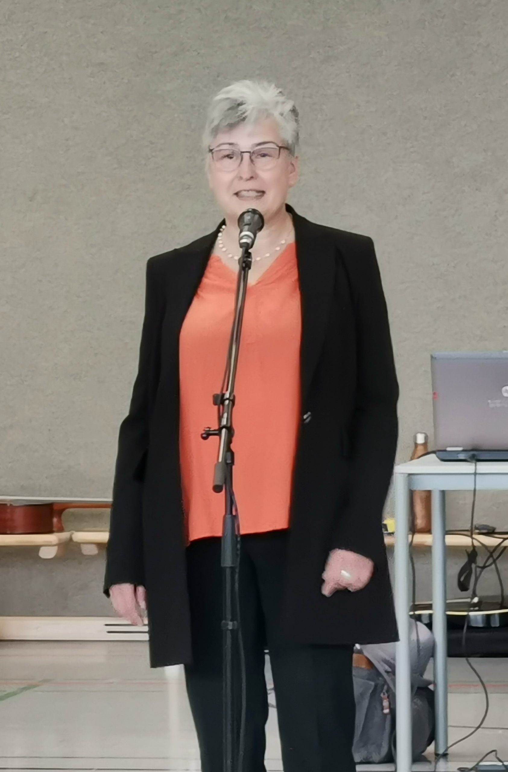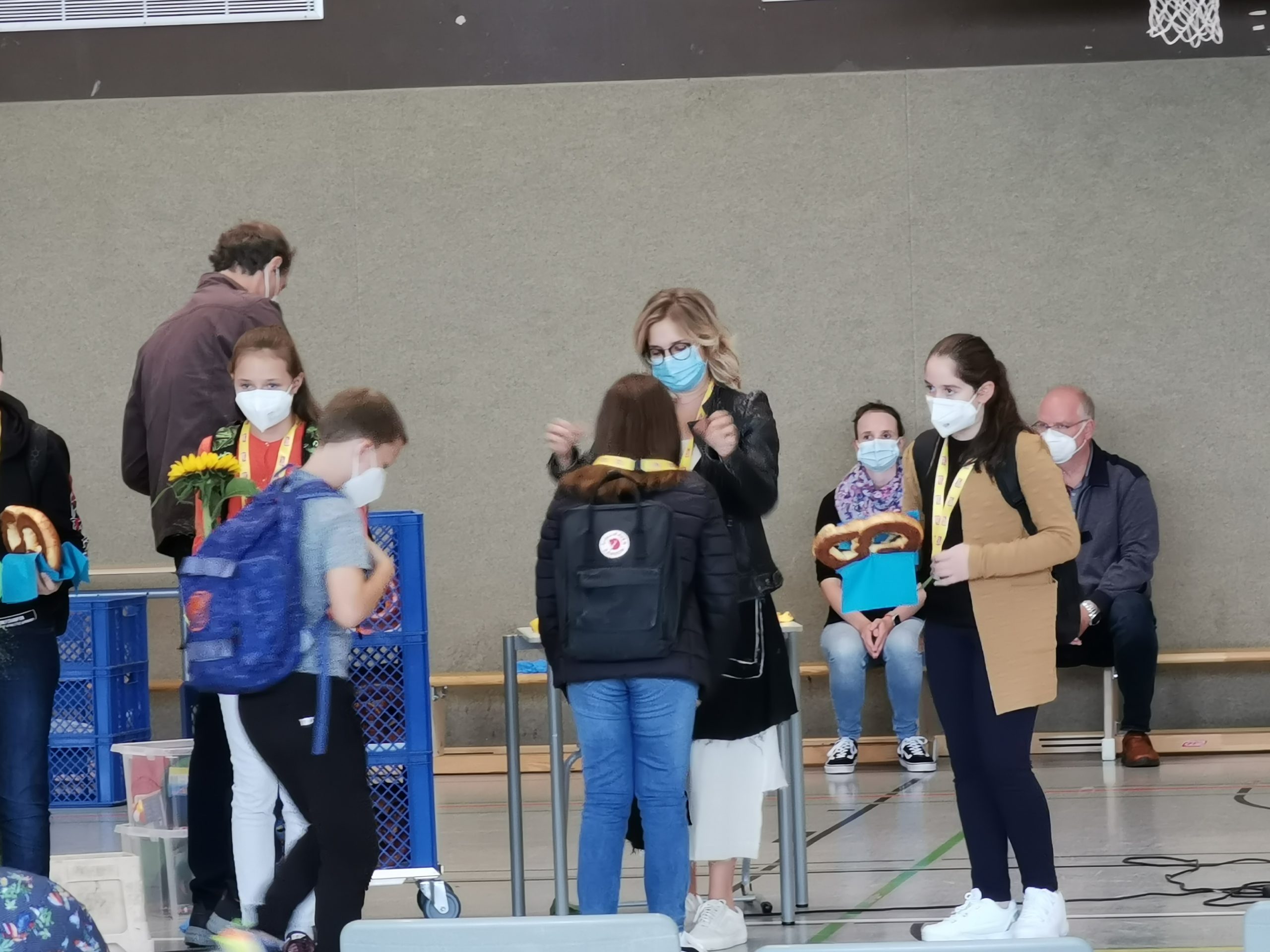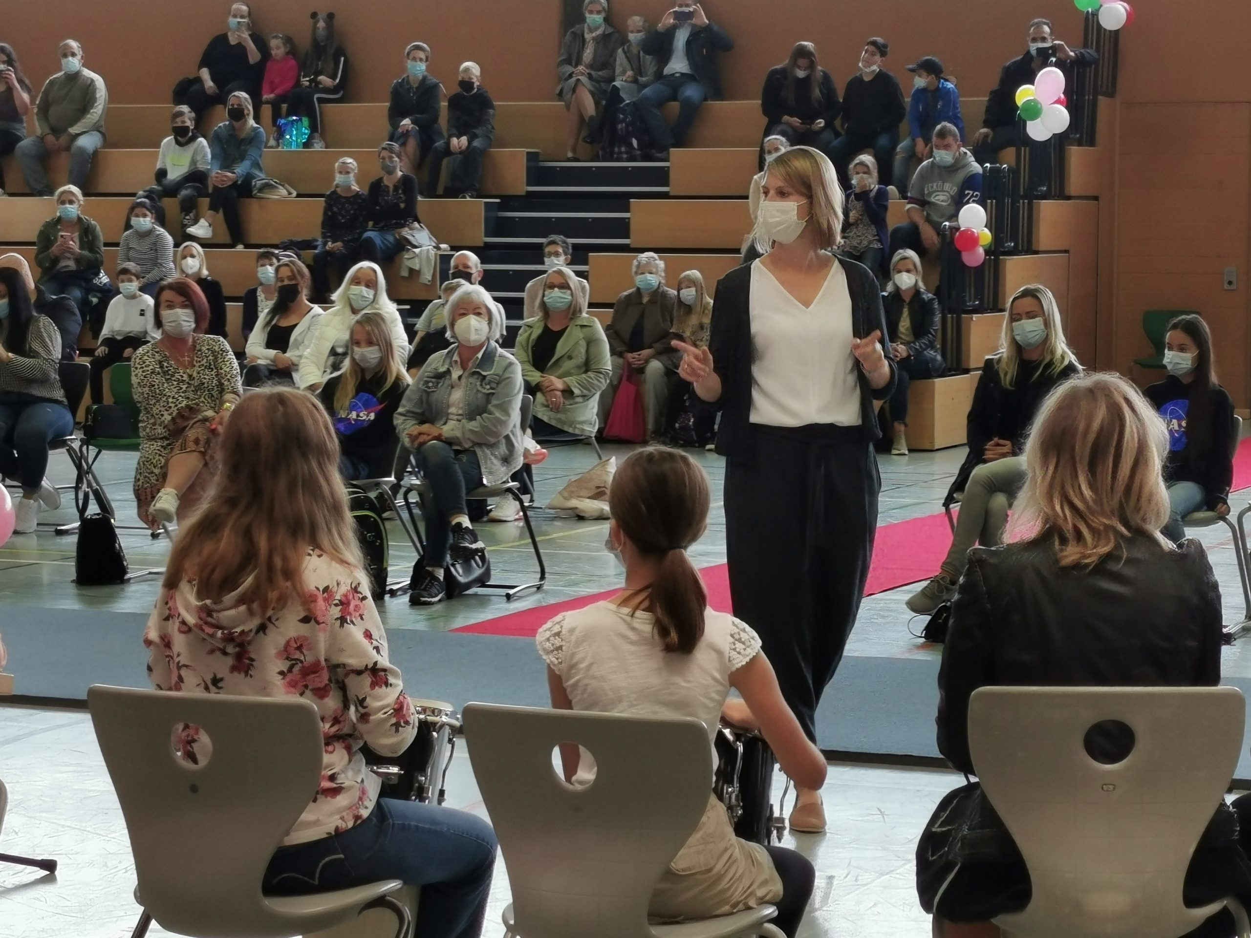 Petra Brüll begrüßte die neuen Schülerinnen und Schüler sowie deren Eltern und machte ihnen mit der Geschichte „Freunde finden leicht gemacht …“ von Dorothee Schmid Mut, neue Freunde an der Schule zu finden und sich aktiv in das Schulleben einzubringen. Auch die Eltern wurden zu letzterem herzlich eingeladen. Es folgte das Lied „Gemeinschaft macht stark“, welches die beiden Musiklehrerinnen Christiane Metzger und Lisa Ludwig unter Begleitung der Schülerband sangen. Nachdem drei Schülerinnen der SV gemeinsam mit dem Verbindungslehrer Max Schneider die Arbeit der Schülervertretung vorgestellt und zum Mitmachen animiert hatten, zeigte eine kleine Gruppe von Schülerinnen aus dem Jahrgang 6 einen von der Sportlehrerin Antonia Döring einstudierten Tanz, bevor es dann schließlich zum spannendsten Teil der Veranstaltung ging: Frau Eidmann las die Einteilung der neuen Klassen vor, die von ihren Klassenlehrertandems Sarah Schmidt und Christiane Metzger (5a), Sabine Binder und Ursula Lanzet-Hallen (5b), Lisa Ludwig und Christof Sanden (5c) sowie Hanna Dreßler und Rolf Schmitz (5d) in Empfang genommen wurden.