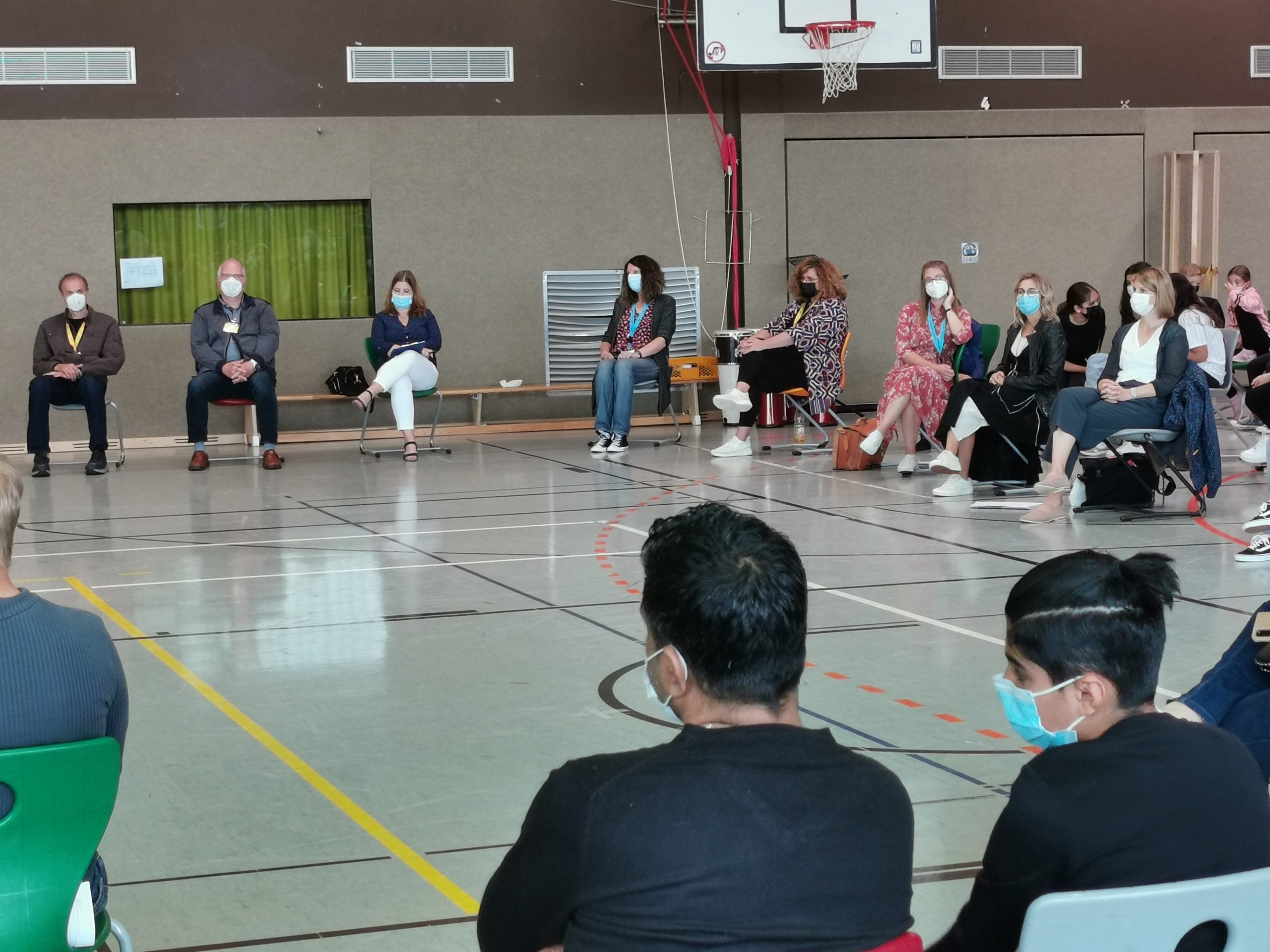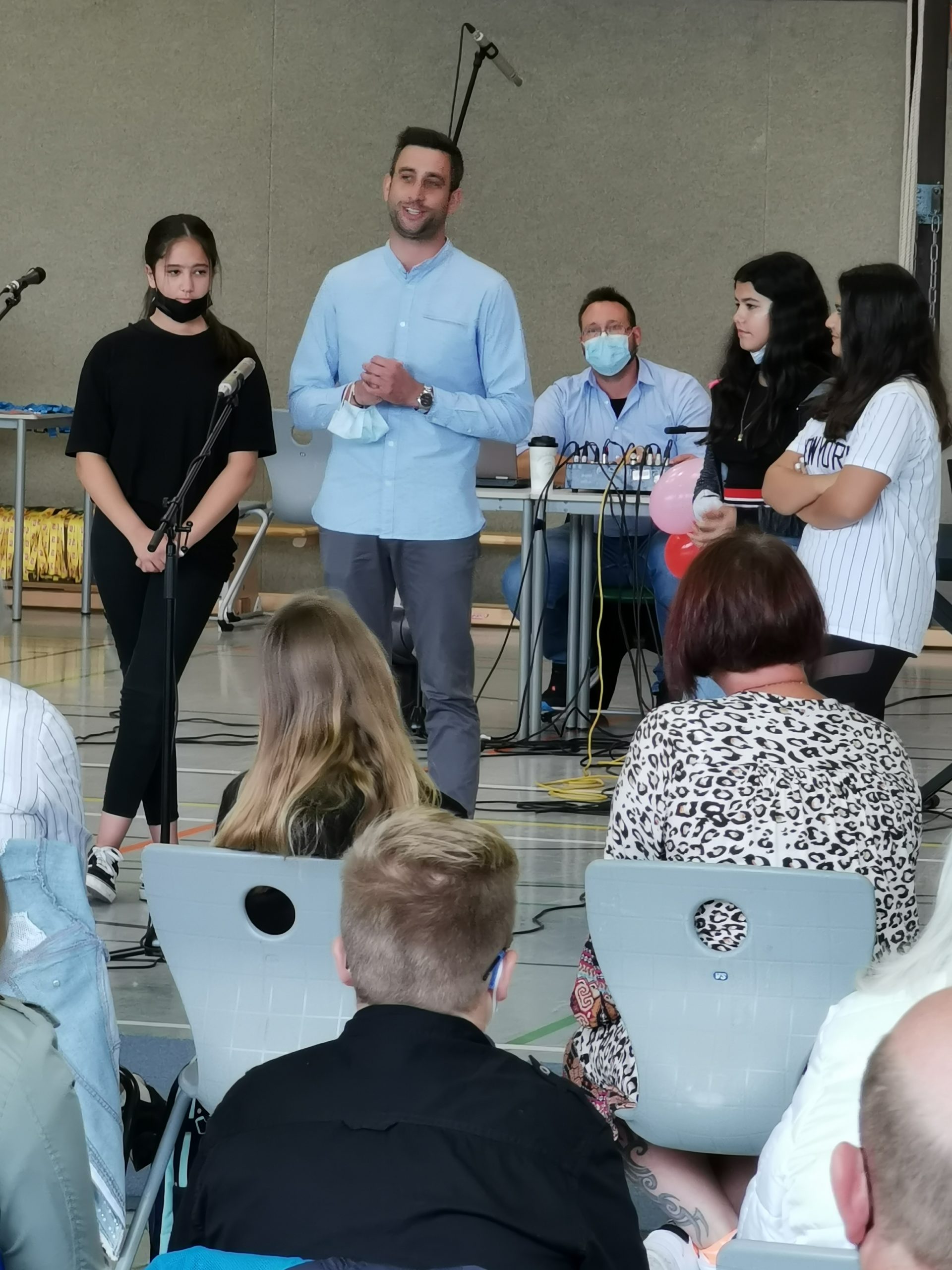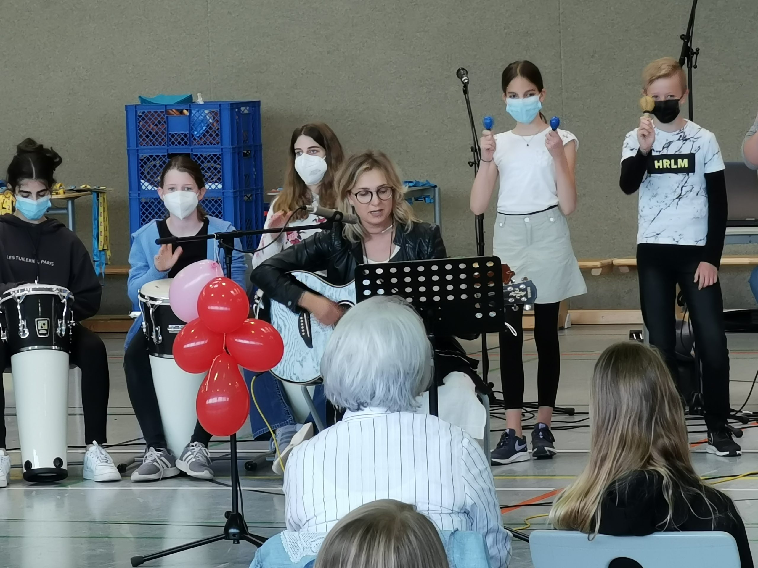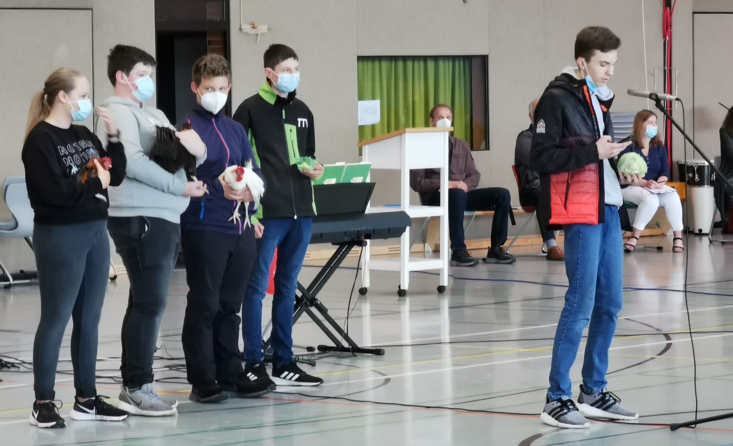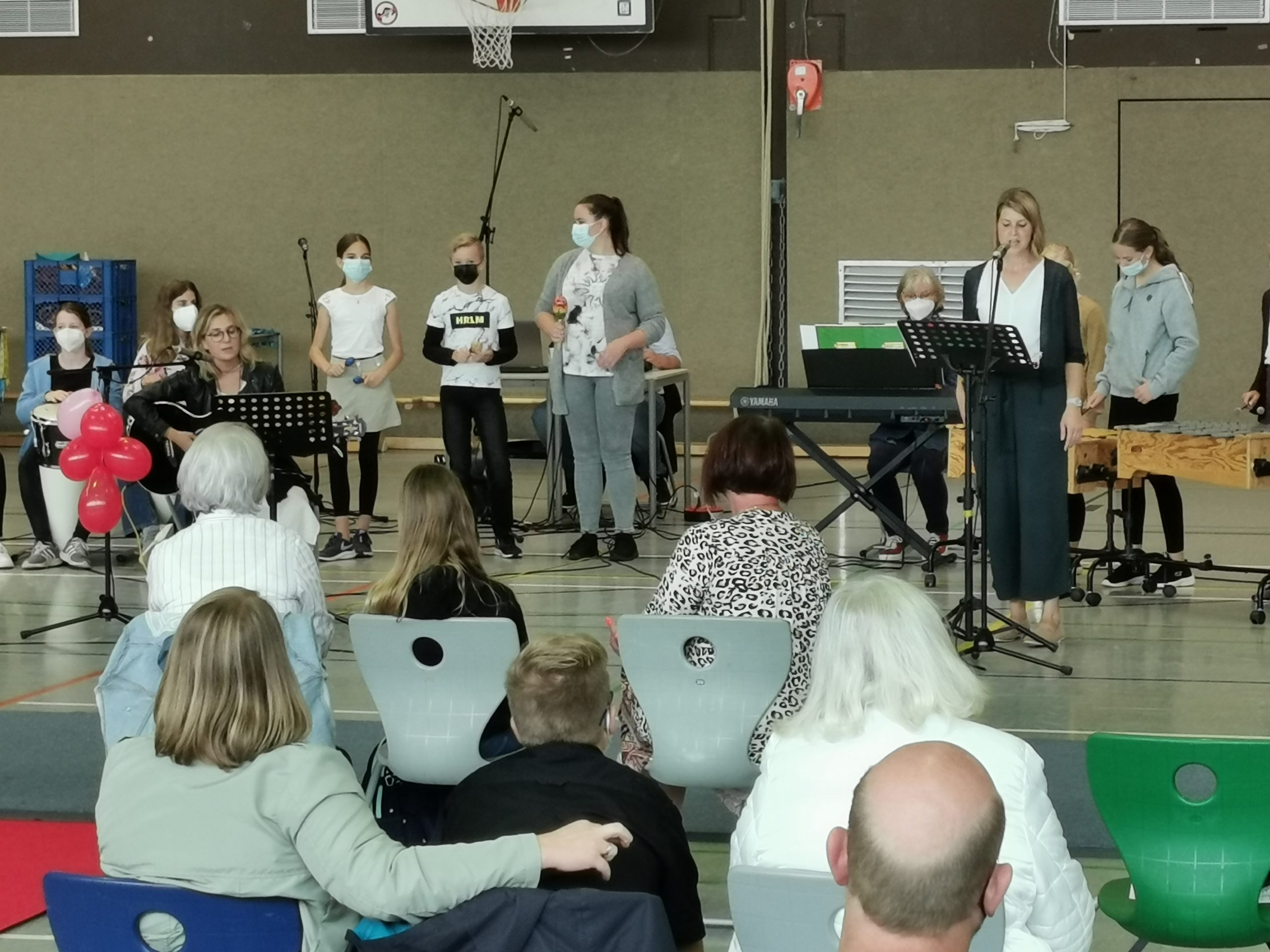 Nachdem bei der Veranstaltung im letzten Jahr pandemiebedingt nur ein ganz kleines Programm möglich war, freuten sich Schulleiterin Petra Brüll und beauftragte Stufenleitung Esther Eidmann umso mehr, dass sich in diesem Jahr wieder unterschiedliche Bereiche der ARS präsentieren konnten. Eröffnet wurde die Veranstaltung durch die Schülerband, die unter der Leitung von Musiklehrerin Christiane Metzger das Lied „Türen auf“ spielte. Anschließend zeigte Bledion Arifi aus der Klasse 7c sein turnerisches Können, bevor einige Teilnehmerinnen und Teilnehmer der Umwelt-AG die Schulhühner Nugget und Co vorstellten.