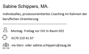 mein Name ist Sabine Schippers. Ich arbeite seit dem 01.09.2016 als Berufs-Orientierungs-Coach an der Adolf- Reichwein-Schule in Pohlheim. Angestellt bin ich beim Zentrum für Arbeit und Umwelt gGmbH Gießen (ZAUG) und arbeite im Rahmen der Initiative „Keiner geht verloren“ des Landkreises Gießen, gefördert aus den Mitteln des Hessischen Ministeriums für Soziales und Integration, aus den Mitteln des Landkreises Gießen sowie durch die Agentur für Arbeit Gießen.