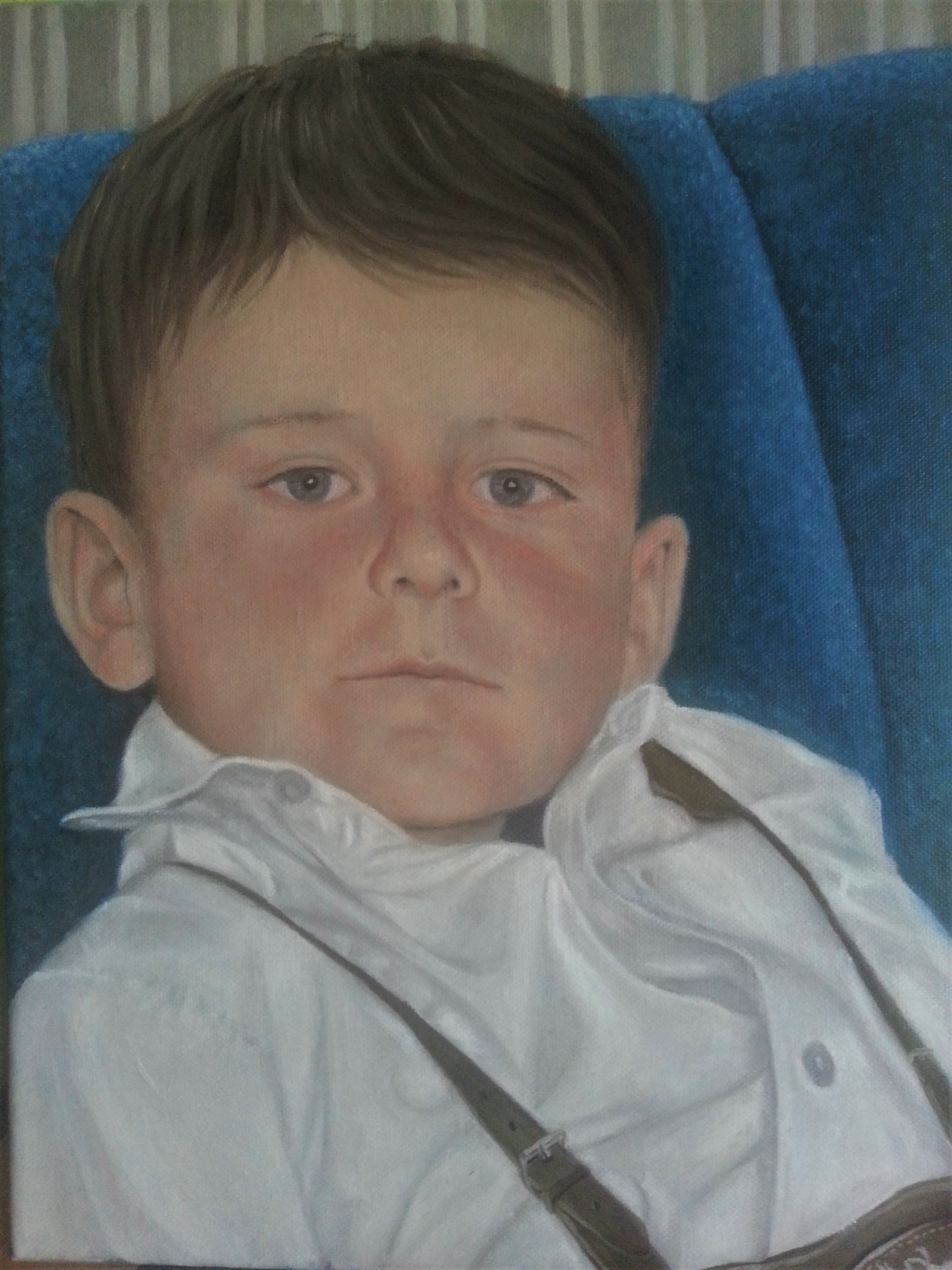 viele wissen, dass ich Portraits male. Dieses Selbstportrait zeigt mich als Vierjährigen. Vorlage war eine kleine Schwarzweißaufnahme. Meine Geschwister sagen, so hätte ich als Kind oft dreingeschaut. Mein Großvater fragte dann immer, ob ich in die nächste Woche schauen würde.